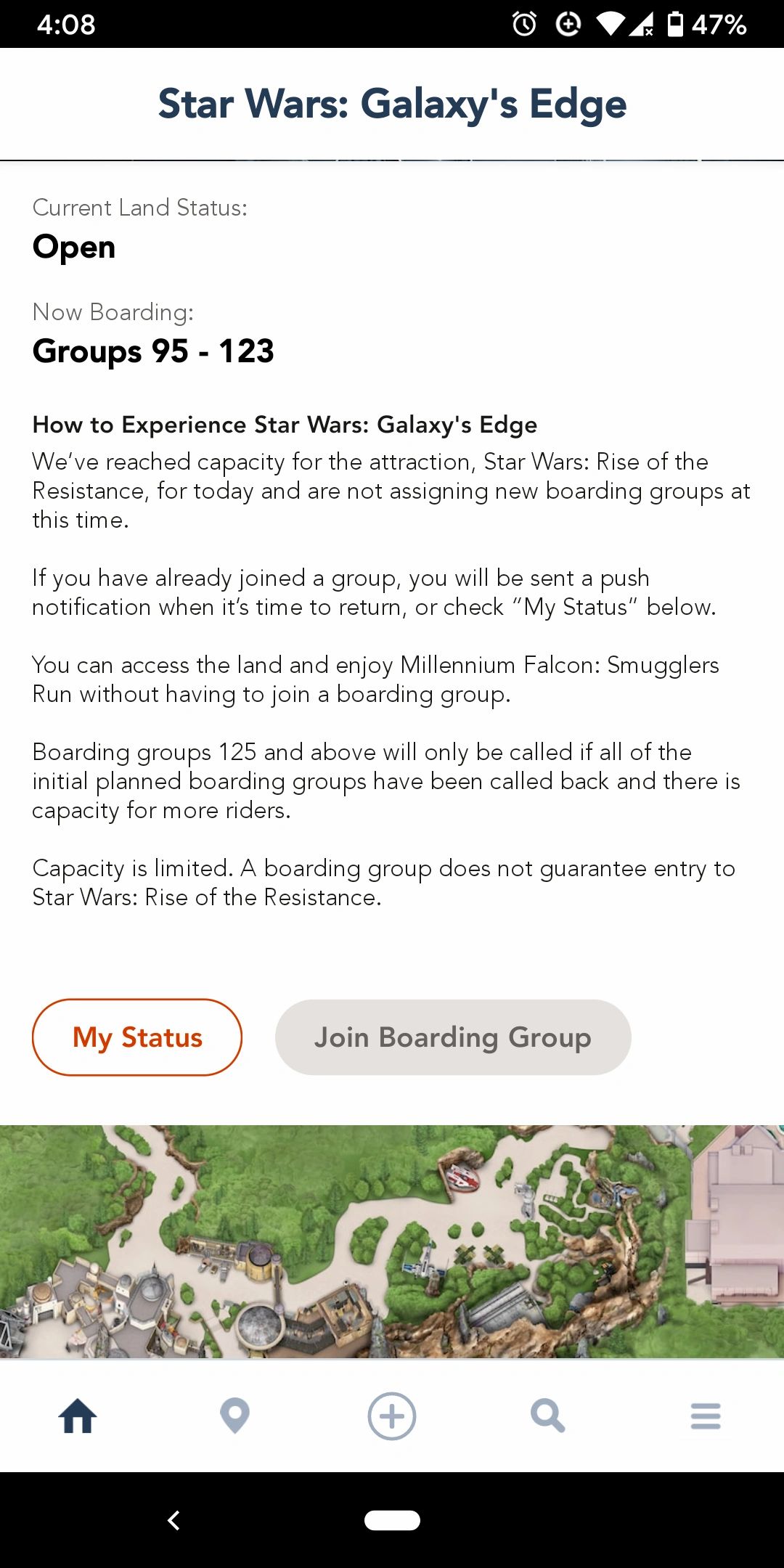 When I entered the park, cast members were handing out flyers that stated boarding groups would open at 7:45am. I went to grab breakfast and as I was walking I noticed a lot of people looking at their phones and then there was an announcement regarding boarding groups. I opened the app and noticed the boarding groups were already open so I hit join boarding group and got boarding group 21. I’m so glad I didn’t wait until the published time of 7:45 since ALL boarding groups for the day were gone by that time.