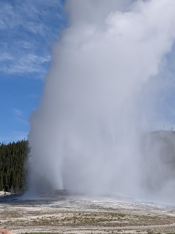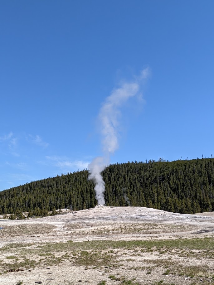 Old Faithful erupts more frequently than other large geysers in the park and it’s fairly easy to predict when it will erupt plus or minus 10 minutes, which is how it got it’s name. On average it erupts every 90 minutes but can be anywhere from 50 minutes to two hours in between eruptions. They are able to predict the timing of the eruption based on the last eruption and how long it lasted. The shorter duration of the eruption, the shorter amount of time in between that eruption and the next. The rangers post the predicted timing of the next eruption. I will say, I saw it erupt twice while I was there and it erupted within 5 minutes of their predicted time.