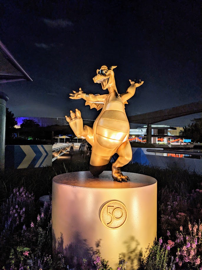 Heading over to Epcot, there are 5 sets of gold statues totaling 9 of the Fab 50 Disney Characters. If you walk around the construction in Future World and arrive at the center walkway leading towards World Showcase Lagoon. You will come to the first gold statue on the left-hand side by the walkway that leads you towards Test Track. Here you will find Epcot’s own Figment!