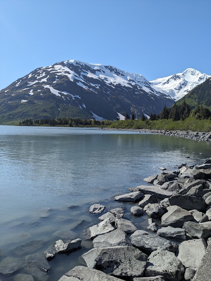 Our next stop was not far from the tunnel to Whittier at Portage Lake. Portage Lake is a popular spot for a day trip from Anchorage. At the lake there is a visitors’ center with information on the area. The views of this glacial lake were beautiful but not nearly as beautiful as they used to be. Nearly a century ago, you would often see the west end of the lake filled with icebergs, but as the Portage Glacier began to retreat, the icebergs became few and far between with now just a random small chunk of ice showing up in the water on rare occasions. The lake is still beautiful to see and is a wonderful example of a glacial lake in Alaska. There are many tours you can take from Anchorage that will take you to Portage Lake and the nearby Portage Glacier.